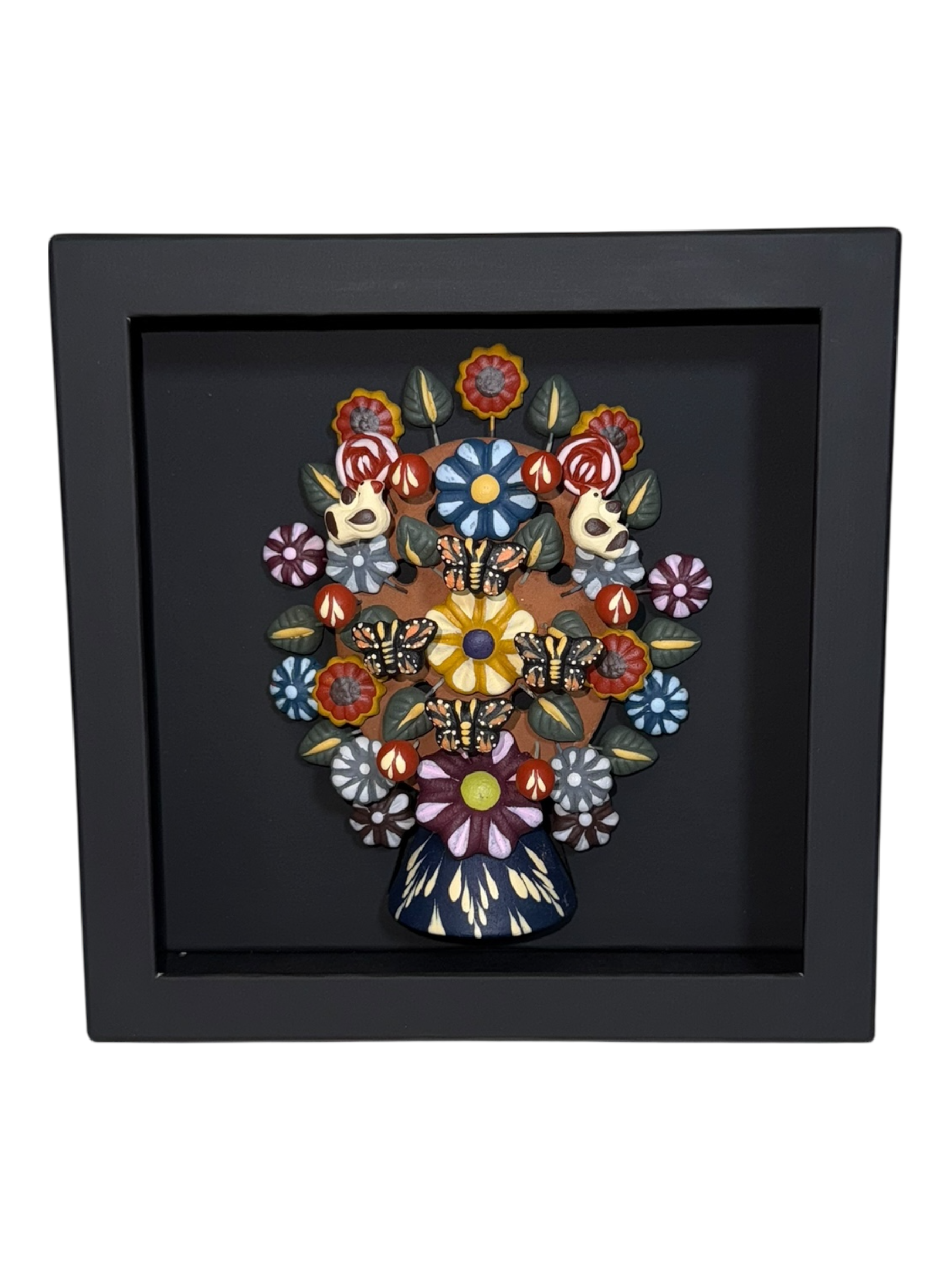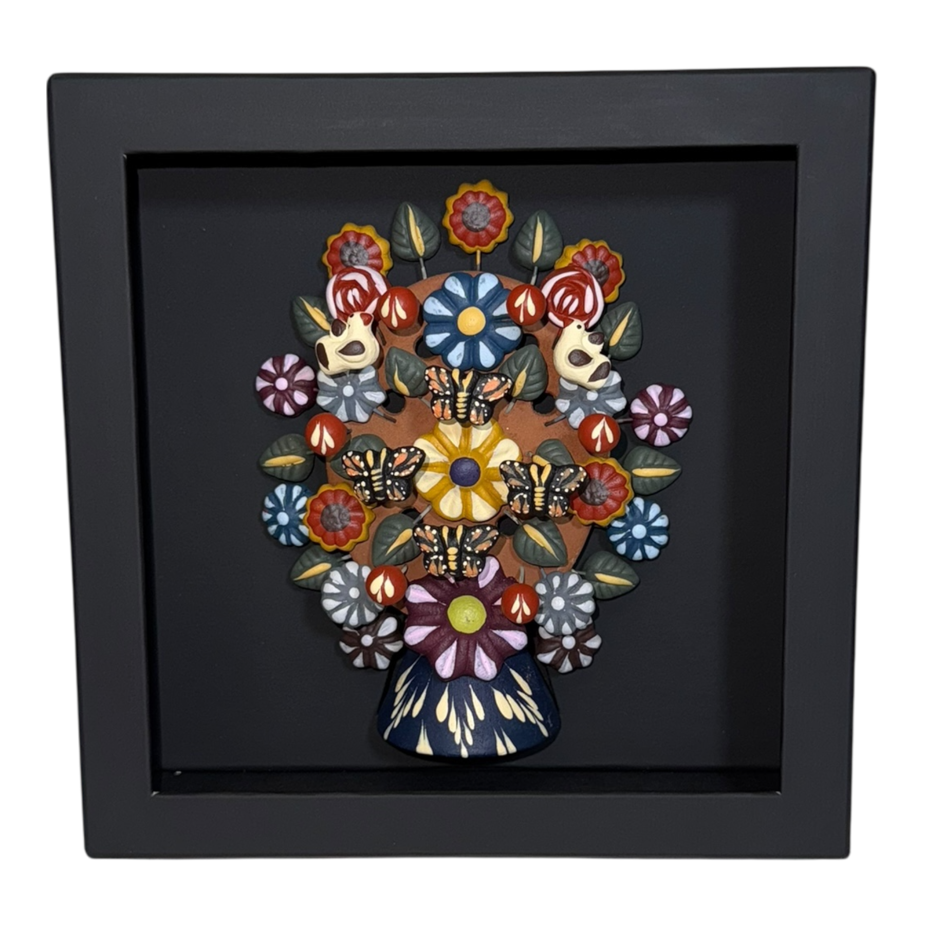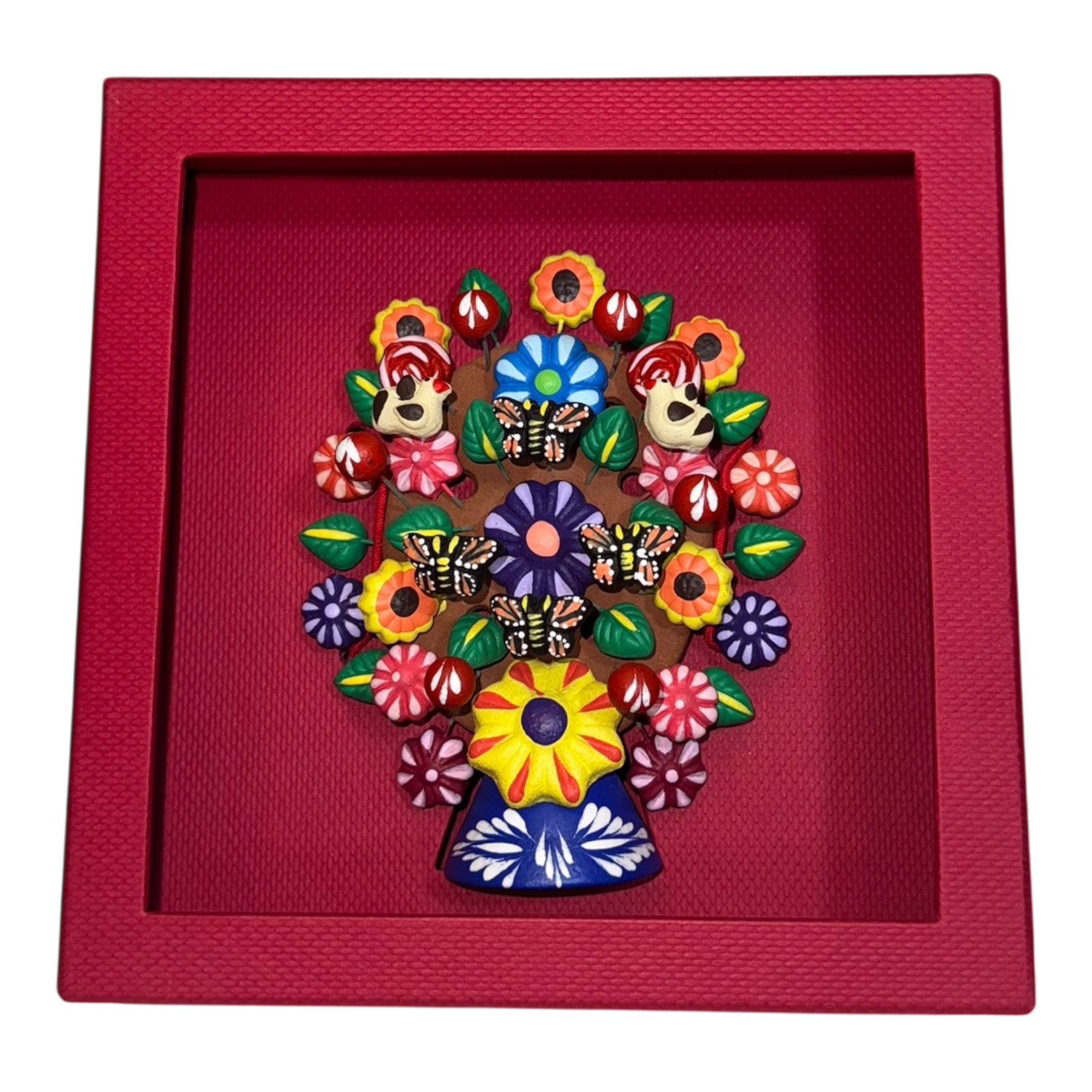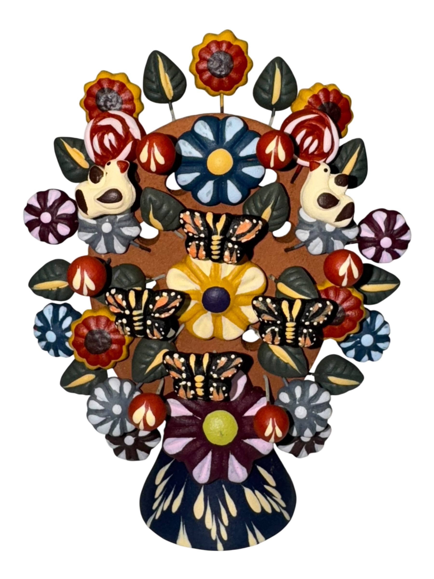 Obra artesanal mexicana elaborada en cerámica, representando la vida, la armonía y la conexión con la naturaleza. Cada pieza es moldeada y pintada a mano, integrando elementos florales y aves en tonos vibrantes.